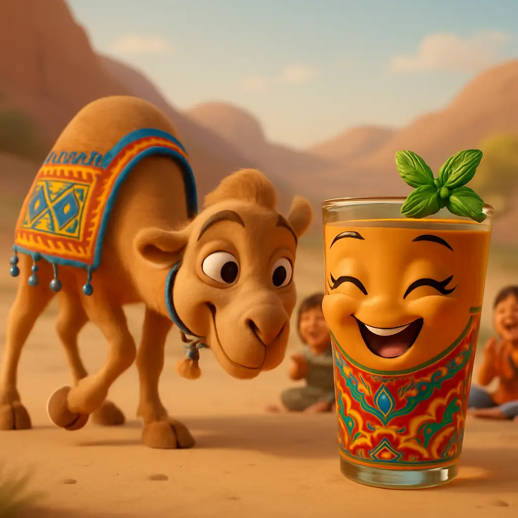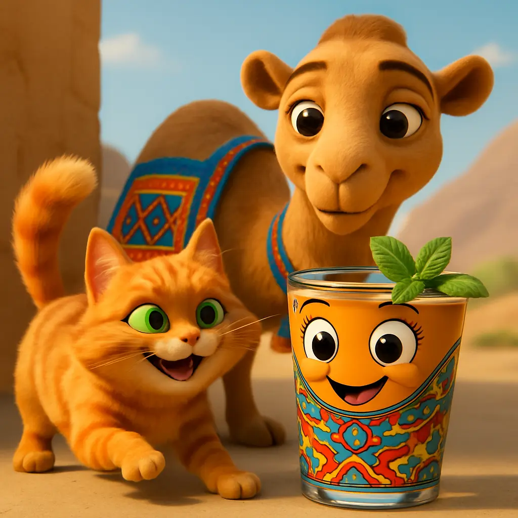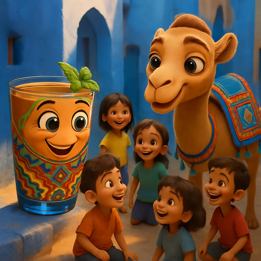 Lalla Mamina, l’ambassadrice du thé marocain, dit au revoir aux portes colorées de Fès. Elle se remplit de thé à la menthe fraîche et se mit en route. La route était longue et poussiéreuse, mais elle chanta une petite chanson en roulant. Le soleil montait plus haut dans le ciel.