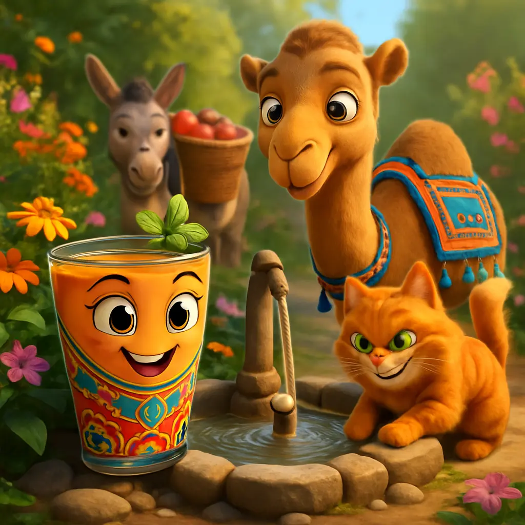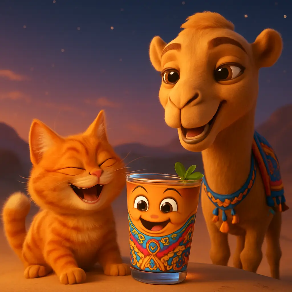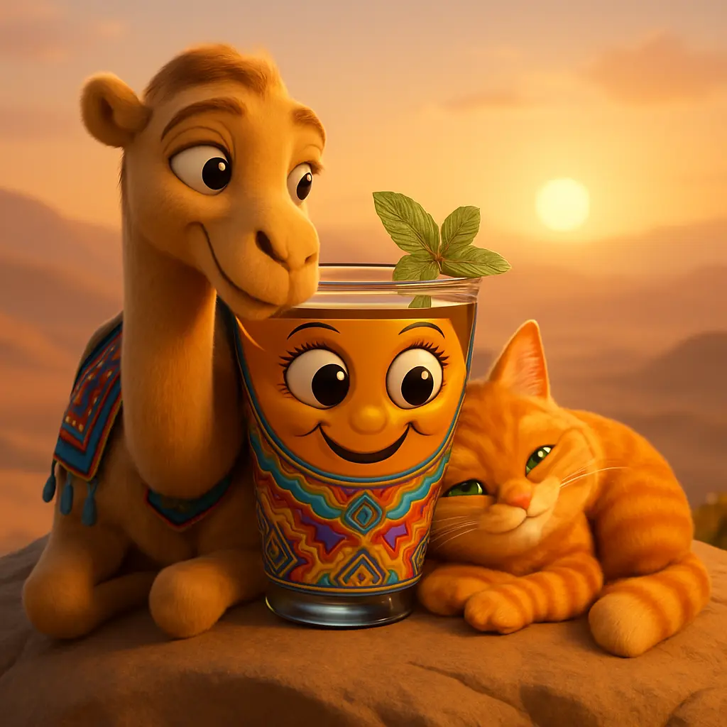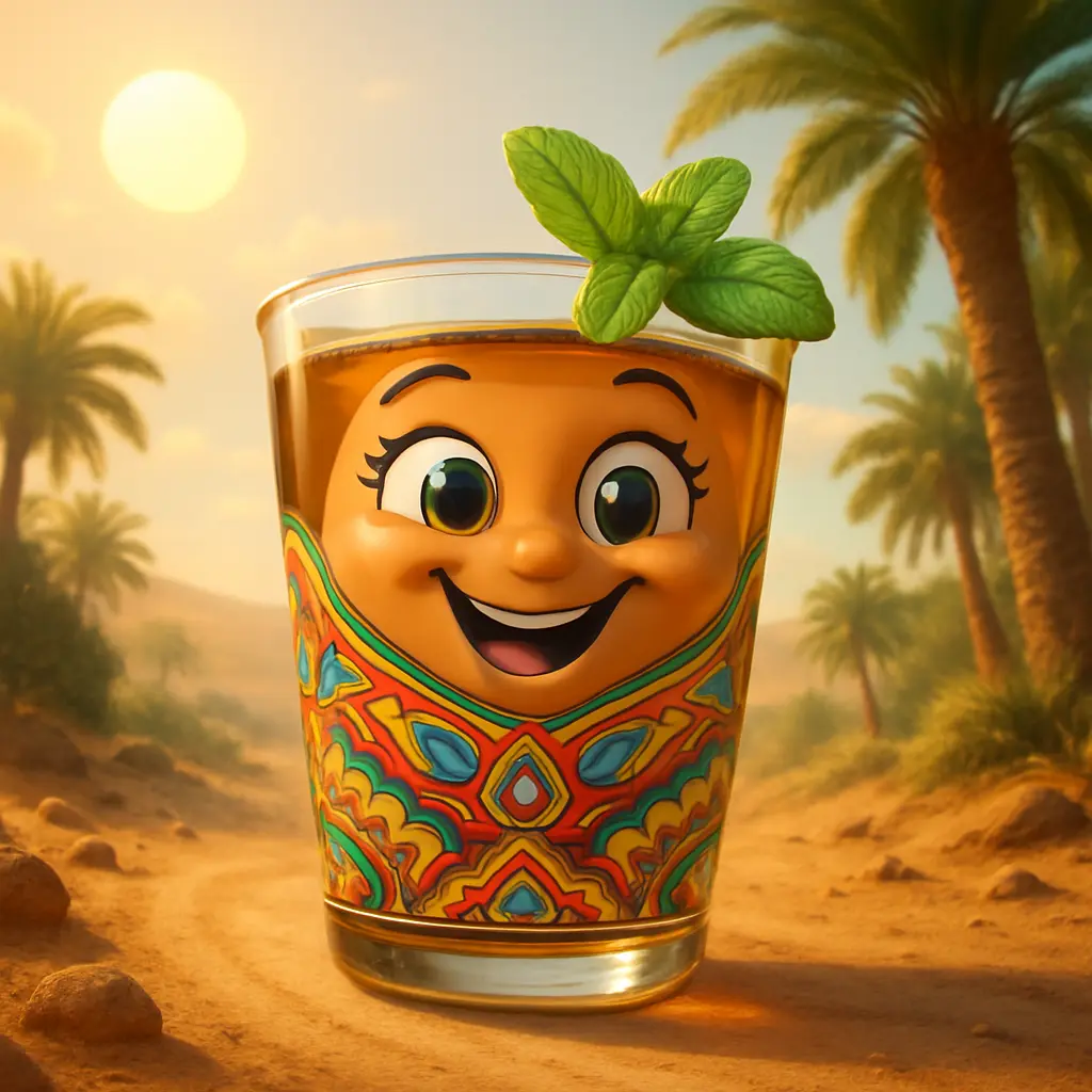 Lalla Mamina, l’ambassadrice du thé marocain, dit au revoir aux portes colorées de Fès. Elle se remplit de thé à la menthe fraîche et se mit en route. La route était longue et poussiéreuse, mais elle chanta une petite chanson en roulant. Le soleil montait plus haut dans le ciel.