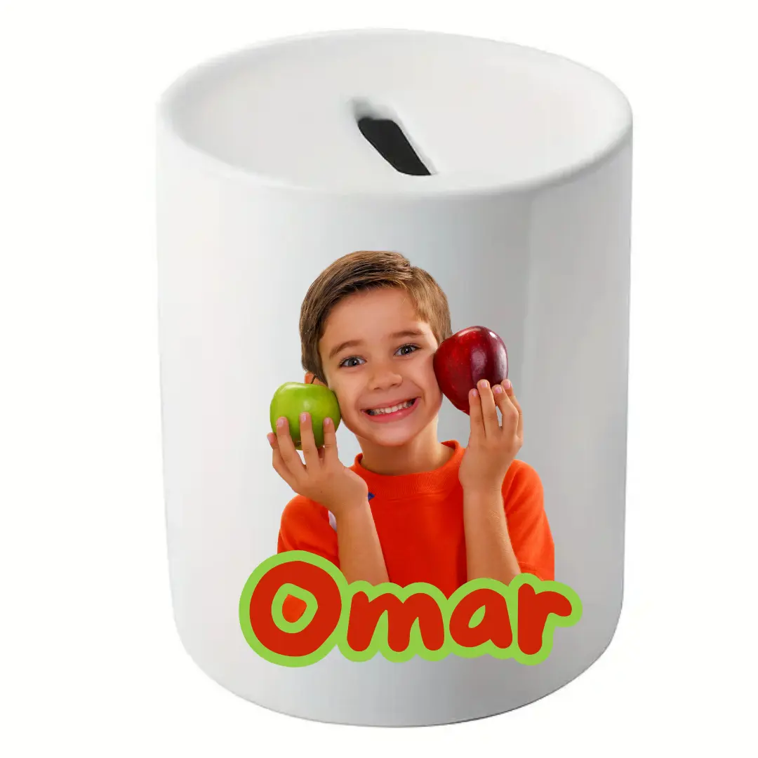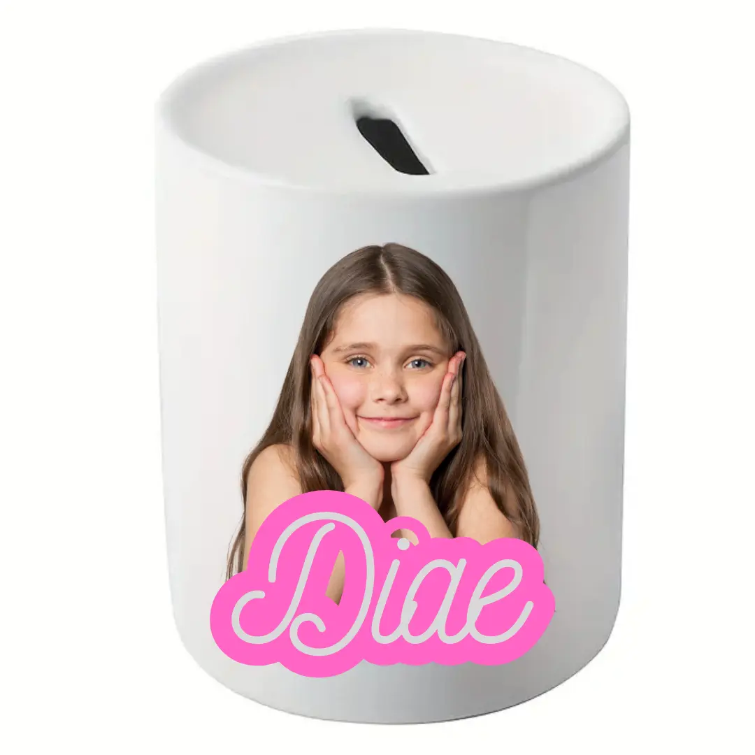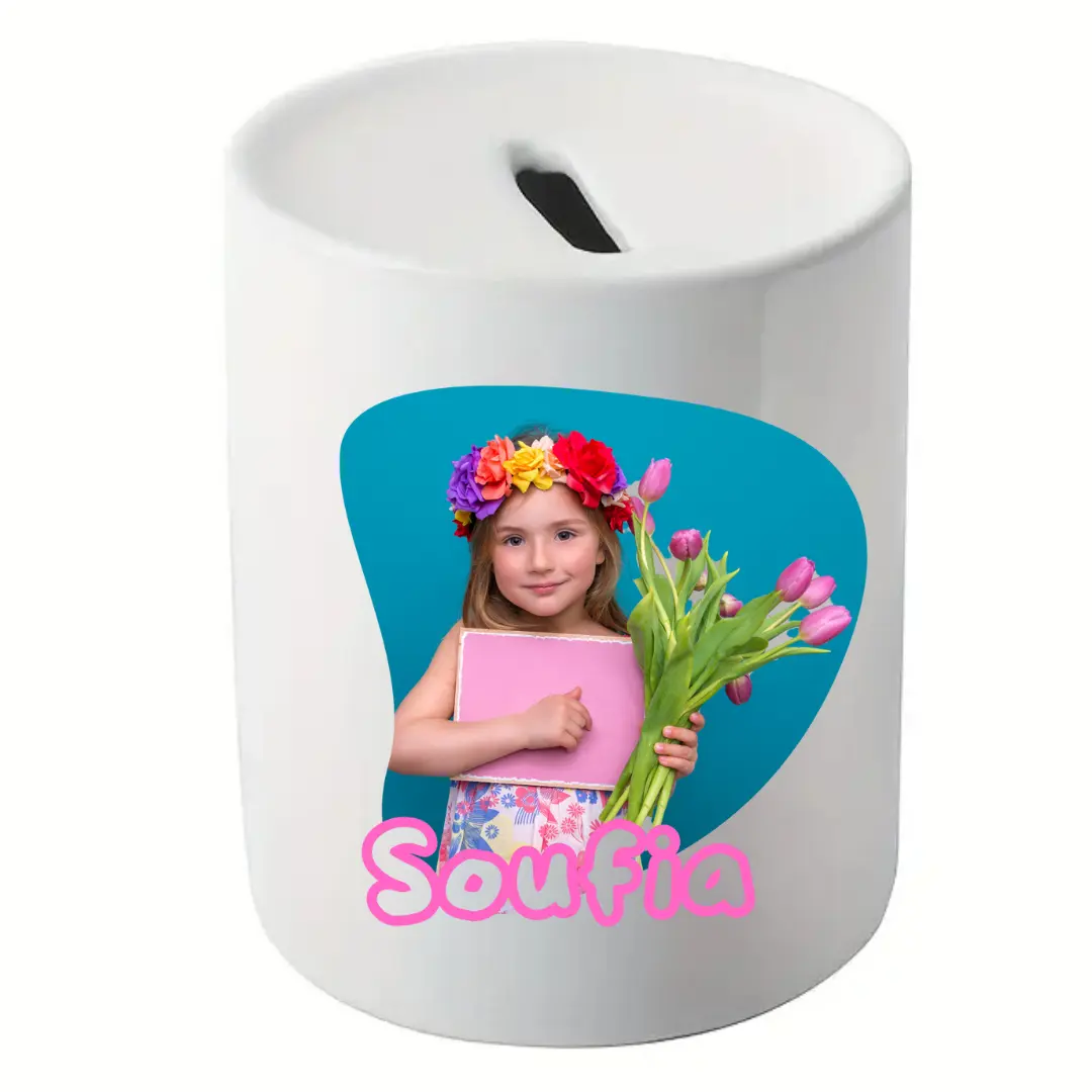 Cette tirelire en céramique blanche de haute qualité, au fini brillant et au design intemporel, associe élégance et praticité. Grâce à notre modèle prédéfini, nos services intègrent le prénom et la photo que vous nous fournissez, pour un rendu totalement personnalisé.